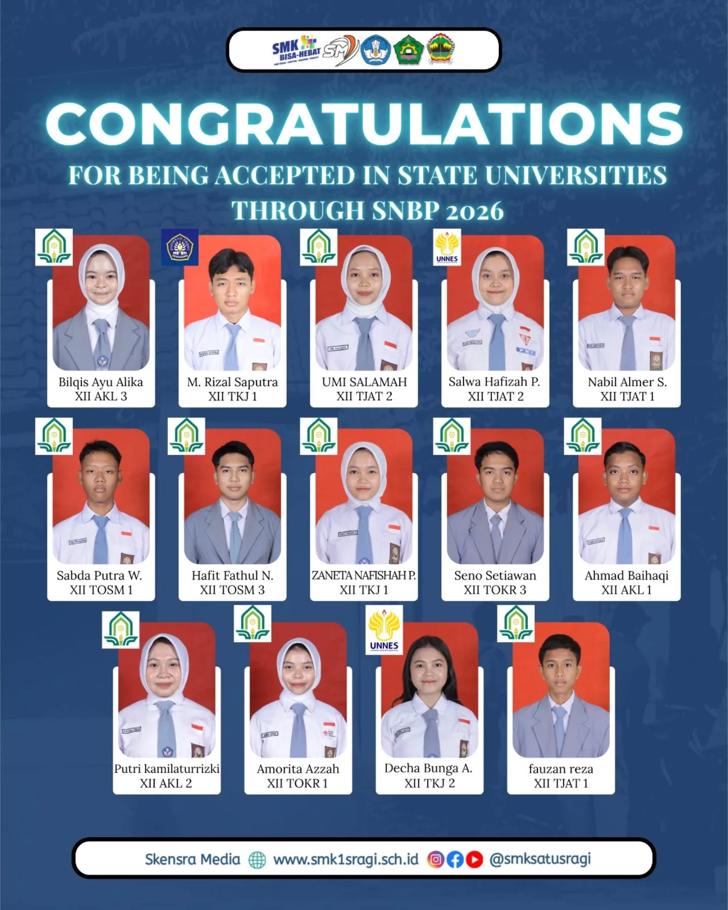 Selamat dan sukses kepada 14 siswa terbaik SMKN 1 Sragi yang telah lolos Seleksi Nasional B